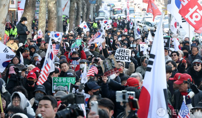 [서울=뉴스핌] 정일구 기자 = 윤석열 전 대통령의 내란 우두머리 혐의에 대한 1심 선고기일인 19일 오후 서울 서초구 서울중앙지방법원 인근에서 윤 전 대통령 지지자들이 선고 결과에 항의하며 구호를 외치고 있다. 서울중앙지법 형사합의25부(지귀연 부장판사)는 이날 윤 전 대통령에게 무기징역을 선고했다. 2026.02.19 mironj19@newspim.com