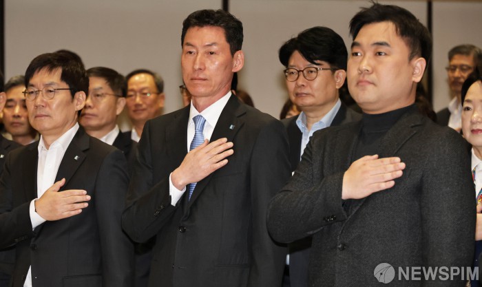 [서울=뉴스핌] 양윤모 기자= 장민영 제28대 IBK기업은행장(가운데)이 20일 오전 서울 중구 을지로 본점 15층 대강당에서 개최된 취임식에 참석해 국민의례를 하고 있다. 장 은행장과 노조는 시간외수당 미지급 문제를 13일 ‘미지급 수당 문제 정상화’에 대한 선언적 합의를 담은 교섭안에 서명했으며 한달만에 취임식을 개최했다. 2026.02.20 yym58@newspim.com