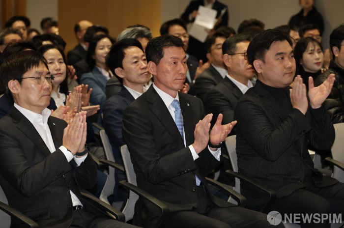 [서울=뉴스핌] 양윤모 기자= 장민영 제28대 IBK기업은행장(가운데)이 20일 오전 서울 중구 을지로 본점 15층 대강당에서 개최된 취임식에 참석해 굳은 표정으로 박수를 치고 있다. 장 은행장과 노조는 시간외수당 미지급 문제를 13일 ‘미지급 수당 문제 정상화’에 대한 선언적 합의를 담은 교섭안에 서명했으며 한달만에 취임식을 개최했다. 2026.02.20 yym58@newspim.com