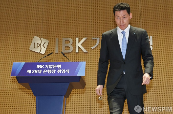 [서울=뉴스핌] 양윤모 기자= 장민영 제28대 IBK기업은행장이 20일 오전 서울 중구 을지로 본점 15층 대강당에서 개최된 취임식에 참석해 취임사를 마치고 자리로 이동하고 있다. 장 은행장과 노조는 시간외수당 미지급 문제를 13일 ‘미지급 수당 문제 정상화’에 대한 선언적 합의를 담은 교섭안에 서명했으며 한달만에 취임식을 개최했다. 2026.02.20 yym58@newspim.com