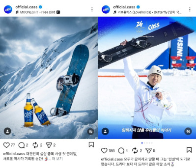 특히 카스는 김상겸 선수의 은메달 소식에 맞춰 기존 온에어 광고를 경기 장면이 담긴 영상으로 전격 교체하며 주목받았다. 영상은 "은메달인데 안 아쉬워?"라는 자막과 "0.19초" 차이라는 내레이션으로 시작해 선수의 경기 모습과 감사 인사를 담았다. 이어 "또 하나의 잊혀지지 않을 이야기를 만들어 준 김상겸 선수에게 축하합니다. 그리고 감사하다"는 메시지로 마무리되며 메달 색깔보다 선수의 이야기에 초점을 맞췄다. SNS에는 "뉴스보다 빠른 축하 콘텐츠", "선수들의 순간을 함께 기억해줘 고맙다"는 반응이 이어졌다.