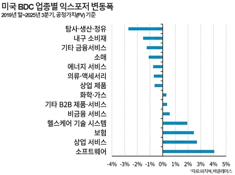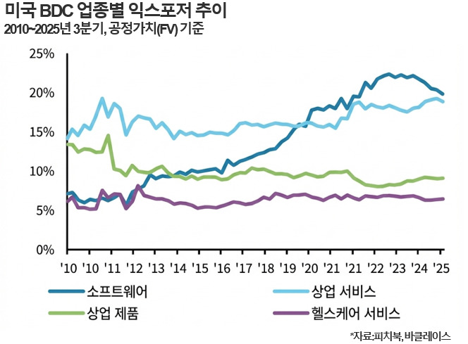 소프트웨어 쏠림은 업계 전반의 현상이다. 소프트웨어 기업은 산업 분류상 기술 업종과 비즈니스 서비스 업종에 걸쳐 분포돼 있는데 BDC 업계 전체 포트폴리오에서 기술 업종(약 24%)과 비즈니스 서비스 업종(약 30%)을 합산하면 25~35%가 AI발 위험에 노출돼 있다(UBS 추산)고 한다. 소프트웨어 업체 매출 기반이 정기 결제형이라 예측 가능성이 높고 마진도 높아 상환 능력이 안정적이라는 판단에 기반한 결과였다.