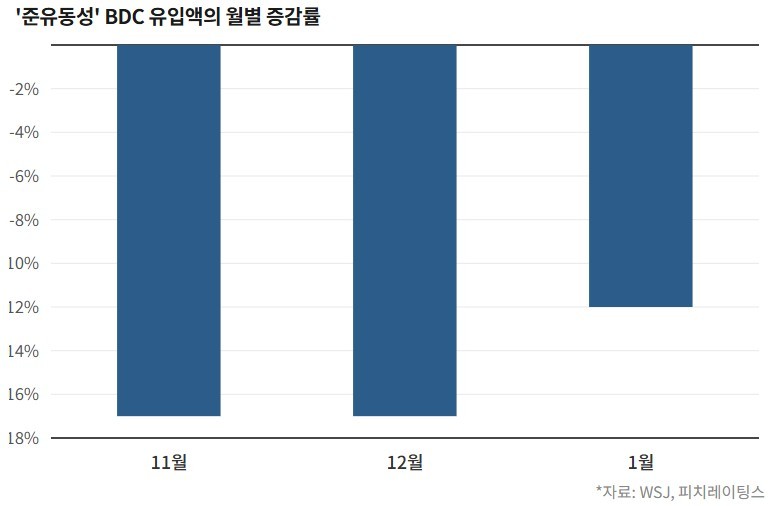 배당 매력이 줄자 자금 흐름이 역전됐다. 로버트 A. 스탠저에 따르면 대형 비상장 BDC의 합산 환매 요청액은 작년 3분기 9억8100만달러에서 적뇬 4분기 29억여달러로 약 200% 급증했다. 업계 최대인 블랙스톤의 준유동성 펀드 월간 유입액도 작년 11월 11억달러에서 올해 1월 6억달러로 거의 반 토막 났다.
