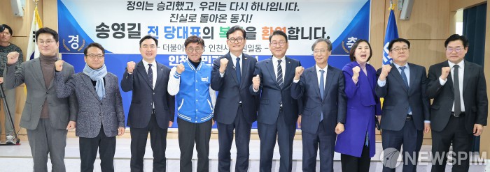 [인천=뉴스핌] 류기찬 기자 = 송영길 전 더불어민주당 대표(왼쪽에서 다섯번째)가 20일 오후 인천 남동구 더불어민주당 인천광역시당에서 복당 원서를 제출하기 전 기념촬영을 하고 있다. 2026.02.20 ryuchan0925@newspim.com