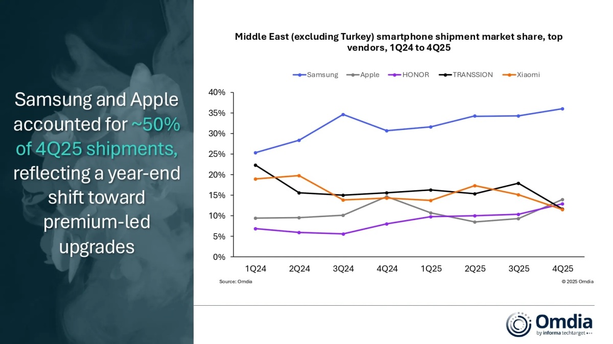 옴디아는 시장 둔화 가능성에도 삼성전자는 비교적 안정적인 흐름을 유지할 것으로 전망했다. 프리미엄 수요가 견조한 사우디와 아랍에미레이트(UAE)를 중심으로 지배력을 이어갈 가능성이 크다는 설명이다.