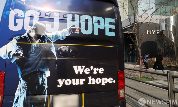 [서울=뉴스핌] 정일구 기자 = 그룹 방탄소년단(BTS)의 완전체 복귀가 한 달여를 앞둔 가운데 20일 오후 서울 용산구 하이브 사옥 앞에 제이홉의 생일을 축하하는 래핑 버스가 주차돼 있다. 2026.02.20 mironj19@newspim.com