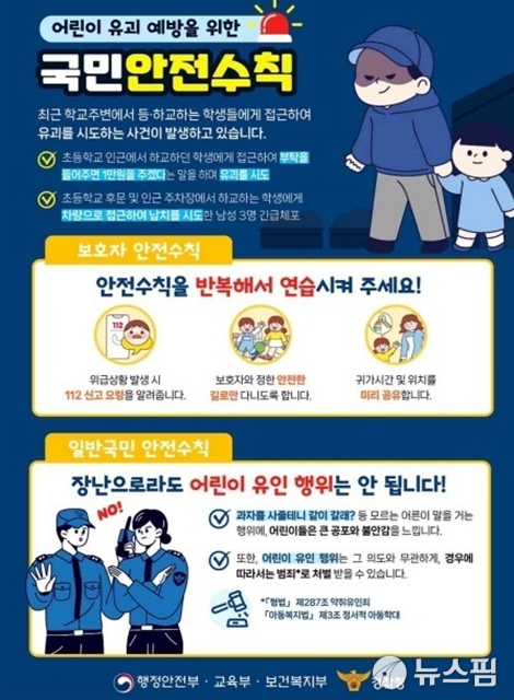 교육부는 어린이 교통·식품안전 등 안전 문화 정착을 위한 '아이먼저' 캠페인을 지속 추진하고, 관계부처 합동 '어린이 등하굣길 안전확보 종합대책' 후속 조치로 어린이 약취·유인 범죄 예방 홍보도 함께 진행한다. 이를 통해 보호자와 어린이를 대상으로 실종 예방 사전등록 등 각종 어린이 보호제도를 적극 알릴 계획이다.