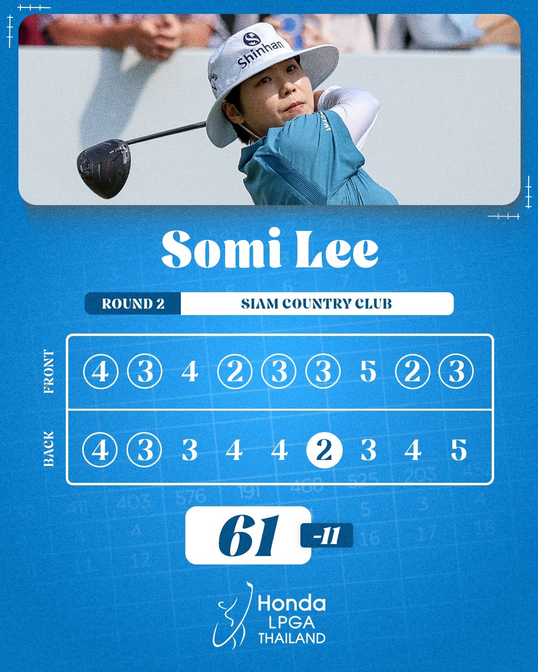 이소미는 20일 태국 촌부리의 시암 컨트리클럽 올드코스(파72)에서 열린 혼다 LPGA 타일랜드 2라운드에서 이글 1개와 버디 9개를 쓸어 담아 11언더파 61타를 기록했다. 중간 합계 17언더파 127타를 적어낸 이소미는 2위 지노 티띠꾼(태국)을 3타 차로 따돌리고 단독 1위에 올랐다.