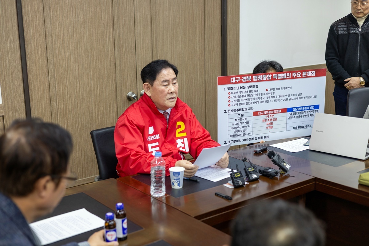 최 전 부총리는 "재정 지원을 법률에 명문화하지 않고 통합부터 하겠다는 것은 결국 대구·경북 살림살이를 이재명 정부가 던져주는 '떡고물'에 의존하겠다는 것 아닌가"고 반문하고 "△20조 원 재정 지원 명문화 △군 공항 이전 및 배후 단지 지원 △바이오백신 특례 복원 및 북부권 의대 설치 등 북부권 발전 핵심 조항 등을 통합법에 명문화할 것"을 촉구했다.