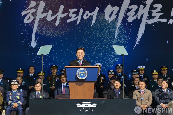 [서울=뉴스핌] 이재명 대통령이 지난 20일 충남 계룡대 대연병장에서 열린 2026년 3군 사관학교 통합임관식에서 축사를 하고 있다. [사진=청와대] 2026.02.21 photo@newspim.com