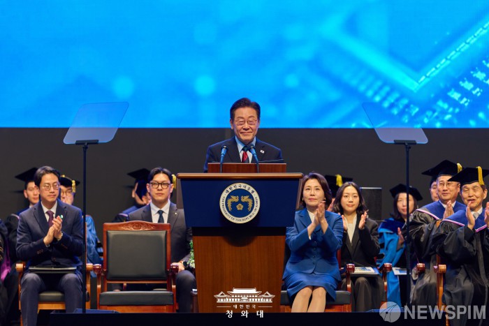 [서울=뉴스핌] 이재명 대통령이 지난 20일 대전 카이스트에서 열린 2026년 학위수여식에서 축사를 하고 있다. [사진=청와대] 2026.02.21 photo@newspim.com