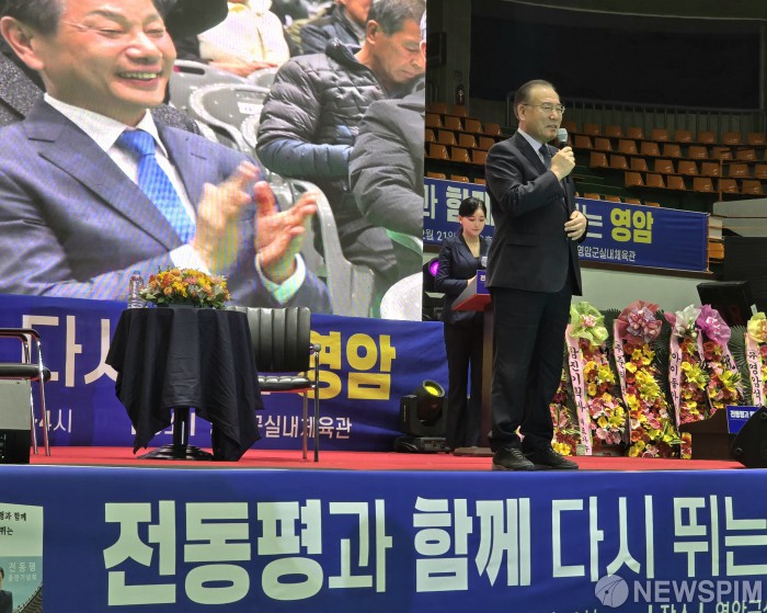[영암=뉴스핌] 조은정 기자 = 이개호 더불어민주당 의원이 21일 오후 전남 영암실내체육관에서 열린 전동평 전 영암군수의 출판기념회에 참석해 축사를 하고 있다. 2026.02.21 ej7648@newspim.com