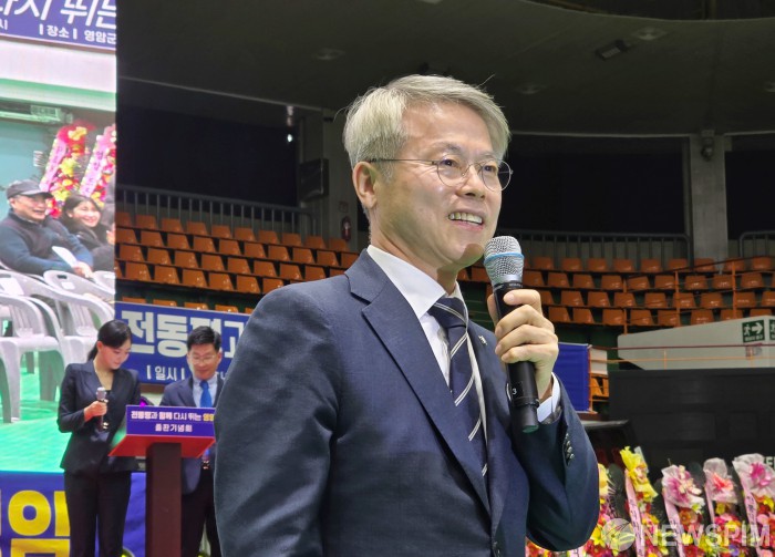 [영암=뉴스핌] 조은정 기자 = 민형배 더불어민주당 의원이 21일 오후 전남 영암실내체육관에서 열린 전동평 전 영암군수의 출판기념회에 참석해 축사를 하고 있다. 2026.02.21 ej7648@newspim.com