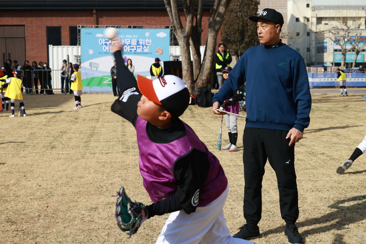 이날 야구교실에는 한화 이글스의 '전설적 좌완'으로 불리는 송진우 감독이 직접 나서 참가 학생들을 지도했다.