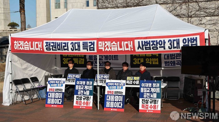 [서울=뉴스핌] 윤창빈 기자 = 송언석 국민의힘 원내대표를 비롯한 당직자들이 23일 오전 서울 여의도 국회 본청 앞 계단에서 정권비리 3대특검 추진 및 사법장악 3대악법 저지를 위한 국회 천막농성을 하고 있다. 2026.02.23 pangbin@newspim.com