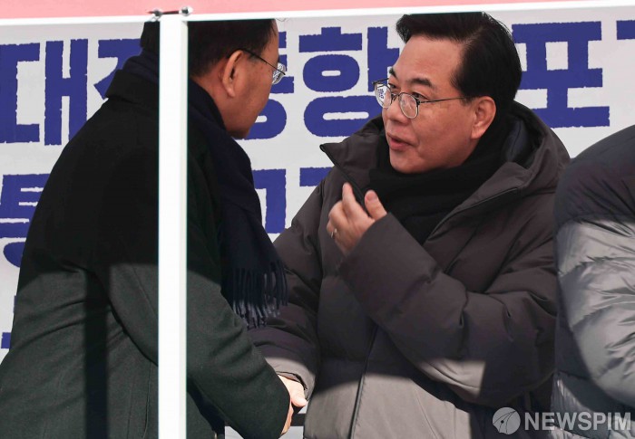 [서울=뉴스핌] 윤창빈 기자 = 송언석 국민의힘 원내대표와 유상범 원내수석부대표가 23일 오전 서울 여의도 국회 본청 앞 계단에서 정권비리 3대특검 추진 및 사법장악 3대악법 저지를 위한 국회 천막농성에 앞서 인사를 나누고 있다. 2026.02.23 pangbin@newspim.com