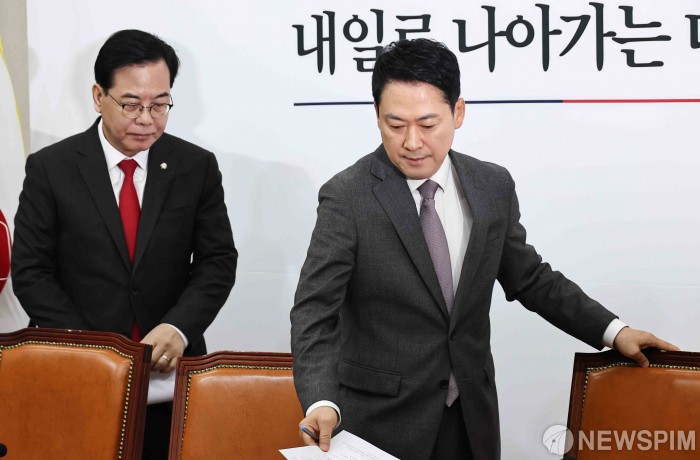 [서울=뉴스핌] 윤창빈 기자 = 장동혁 국민의힘 대표, 송언석 원내대표가 23일 오전 서울 여의도 국회에서 열린 최고위원회의에 참석하고 있다. 2026.02.23 pangbin@newspim.com