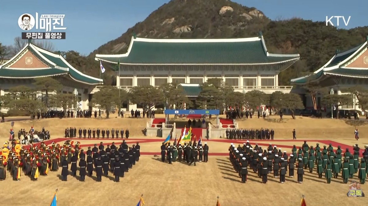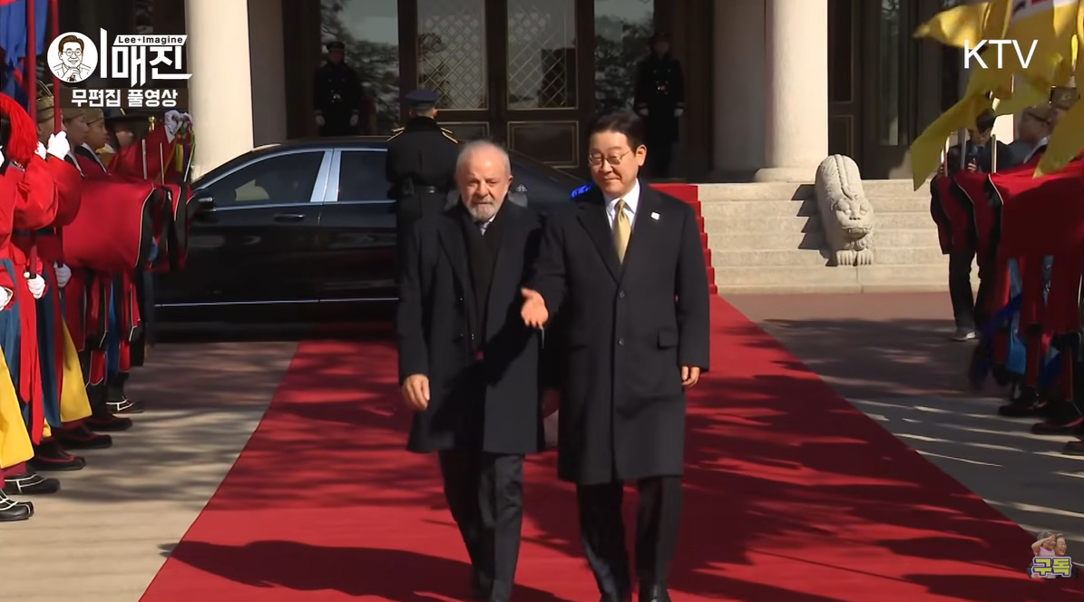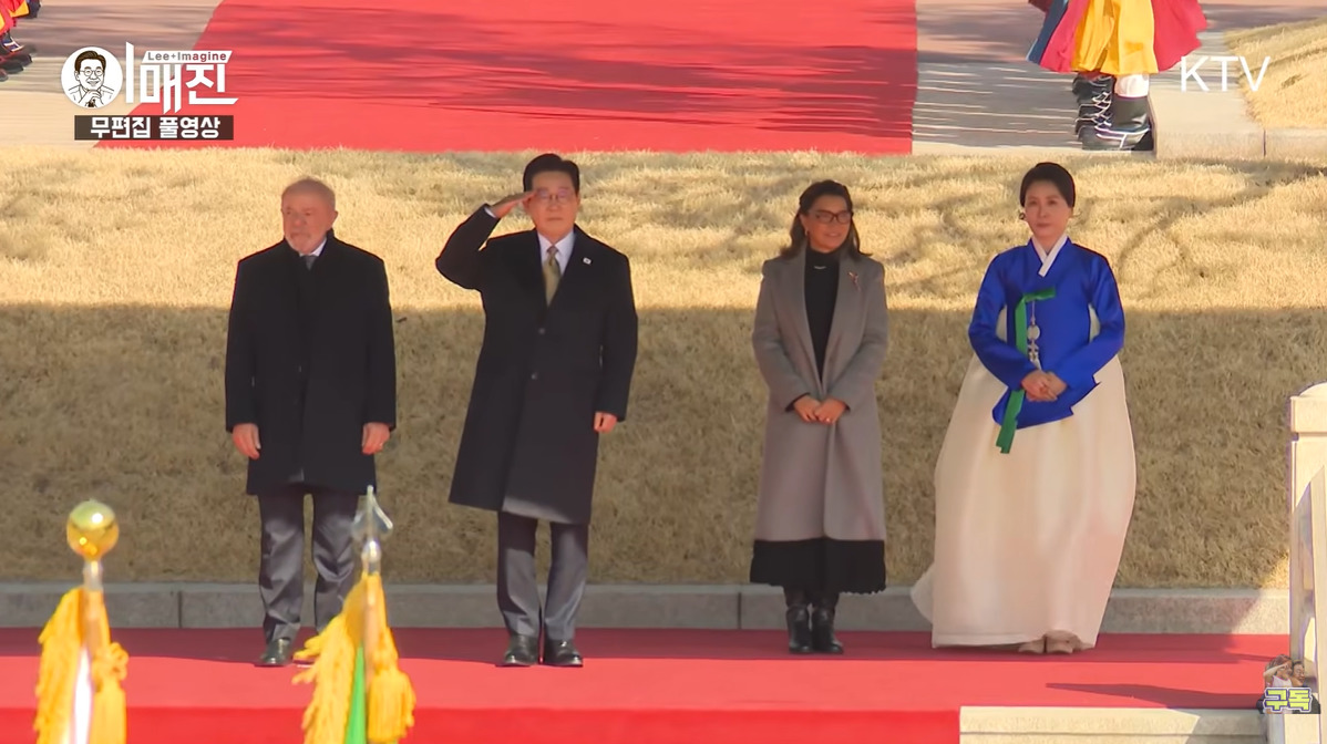 두 나라 정상은 이후 대정원으로 이동해 나란히 의장대를 사열했다. 사열대 중앙 기수단 앞에서 국기에 대한 경례를 했다. 룰라 대통령은 이동하면서 기수단을 향해 고개를 숙여 인사하기도 했다.
