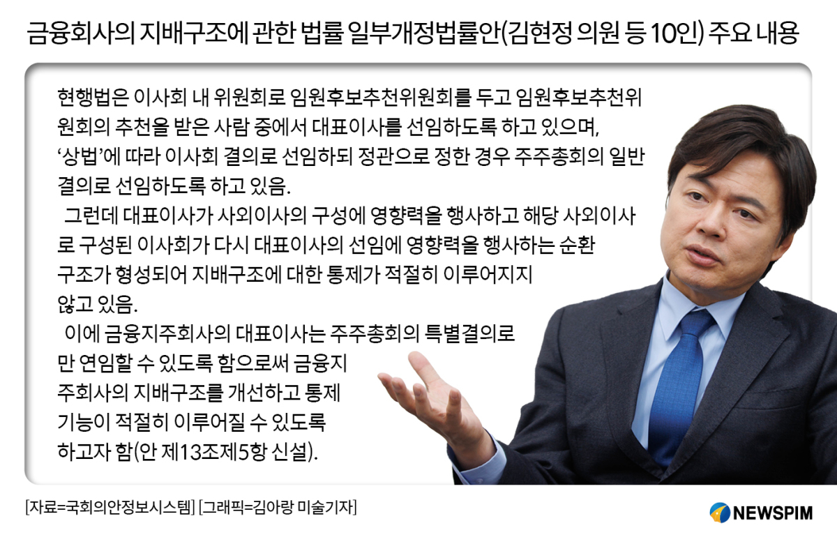 [서울=뉴스핌] 정광연 기자 = 금융당국에 이어 국회에서도 금융그룹 회장 연임 기준 강화를 골자로 하는 지배구조 개선안에 속도를 내고 있다. 현행 '일반결의(총 주식 1/4 이상 출석, 1/2 이상 찬성)'에서 '특별결의(총 주식 1/3 이상 출석, 2/3 이상 찬성)'로 기준을 강화하는 방안이 유력하다.