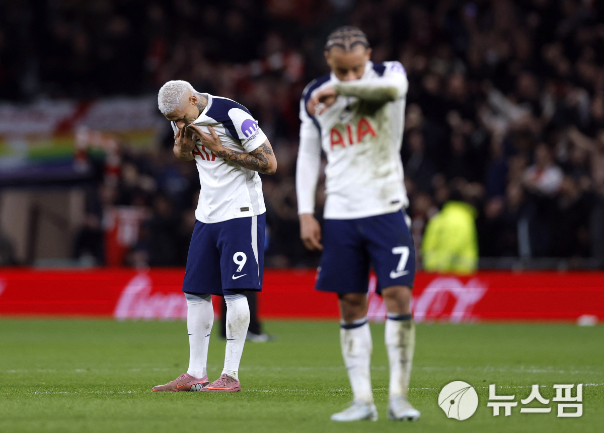 [런던 로이터=뉴스핌] 아스널에게 1-4로 패하자 토트넘의 히샬리송(왼쪽)과 사비 시몬스가 낙담하고 있다. 2026.02.23 wcn05002@newspim.com