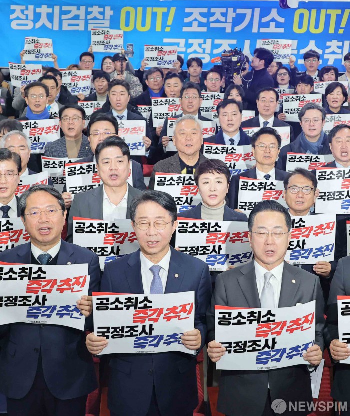 [서울=뉴스핌] 윤창빈 기자 = 23일 오전 서울 여의도 국회 의원회관에서 열린 이재명 대통령 사건 공소취소와 국정조사 추진을 위한 의원모임 출범식에서 더불어민주당 의원들이 피켓을 들고 구호를 외치고 있다. 2026.02.23 pangbin@newspim.com