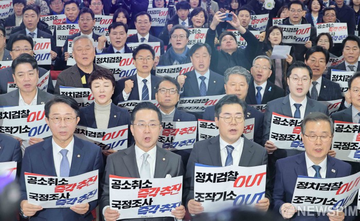 [서울=뉴스핌] 윤창빈 기자 = 23일 오전 서울 여의도 국회 의원회관에서 열린 이재명 대통령 사건 공소취소와 국정조사 추진을 위한 의원모임 출범식에서 더불어민주당 의원들이 피켓을 들고 구호를 외치고 있다. 2026.02.23 pangbin@newspim.com