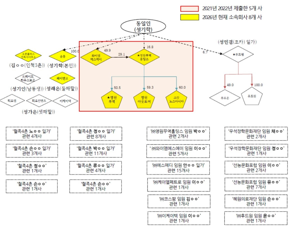 성 회장이 지분 100%를 보유한 솜톰을 비롯해, 본인의 친족이 소유한 래이앤코, 이케이텍, 피오컨텐츠, 티오엠, 트레이드하우스보고, 푸드웰, 푸르온, 후드원 등 소속회사 내역은 2022년까지 지정자료로 포함되지 않았다.
