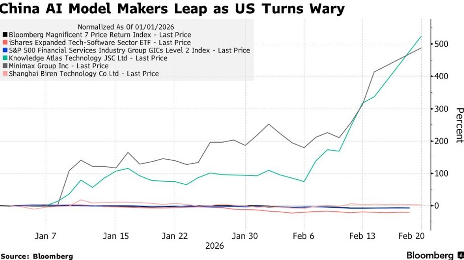 새로운 모델을 출시하거나 기존 모델을 업그레이드한 현지 기업들이 투자자들의 집중 매수 대상이 되고 있다. 미니맥스 그룹(0100.HK)과 날리지아틀라스테크놀로지(지푸, 2513.HK)는 가장 주목받는 사례로, 두 종목의 주가는 2월 들어 두 배 넘게 급등했다. 모건스탠리를 비롯한 월스트리트 투자은행들의 강력 매수 의견이 낙관론에 불을 지피고 있으며, 순수 AI 플레이 종목들이 전통적인 인터넷 대기업으로부터 투자 자금을 빨아들이고 있다.