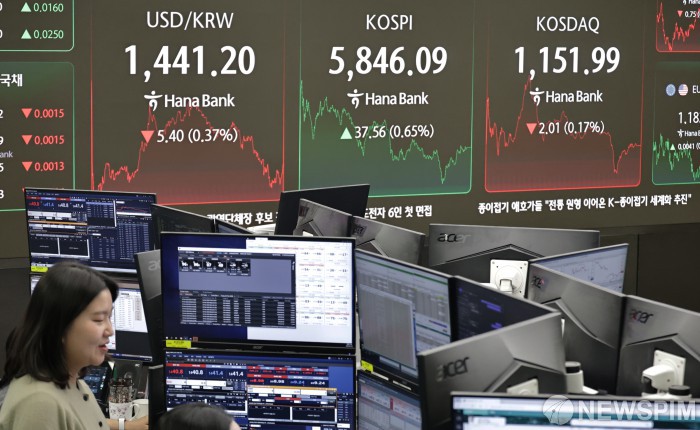 [서울=뉴스핌] 양윤모 기자= 美 관세 위법 판결속 23일 오후 코스피가 전장 종가보다 37.56 포인트(0.65%) 상승하며 5846.09로, 코스닥은 2.01 포인트(0.17%) 상승한 1151.99로 거래를 마감한 가운데, 서울 중구 하나은행본점 딜링룸에서 직원들이 업무를 보고 있다. 서울외환시장에서 달러/원 환율은 전장 대비 5.40원 하락한 1441.20원에 주간거래를 마감했다. 2026.02.23 yym58@newspim.com