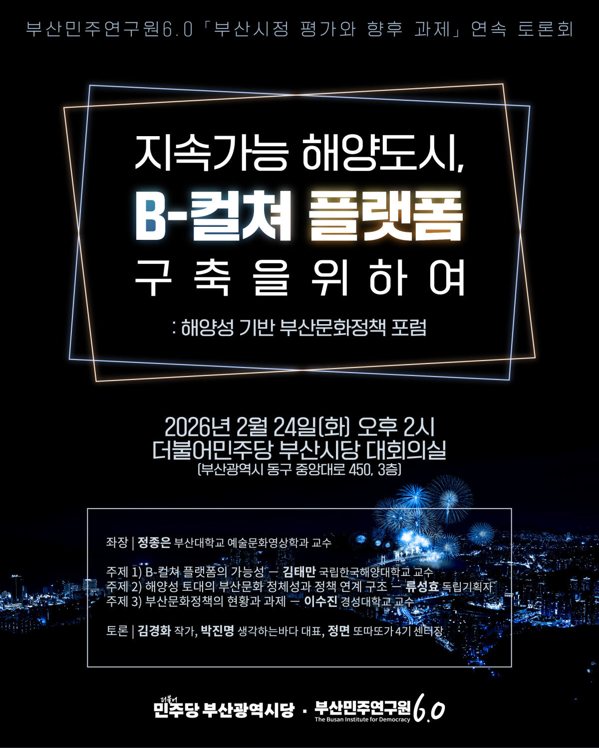 부산민주연구원6.0은 24일 오후 2시 민주당 부산시당 대회의실에서 '지속 가능한 해양도시, B-컬처 플랫폼 구축을 위하여'라는 주제로 '부산시정 평가와 향후 과제' 연속토론회 5탄을 개최한다고 23일 밝혔다.