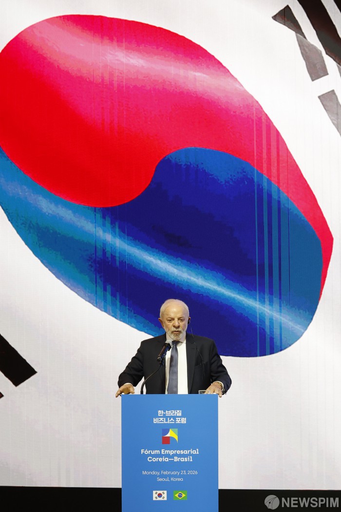 [서울=뉴스핌] 류기찬 기자 = 루이스 이나시우 룰라 다 시우바 브라질 대통령이 23일 오후 서울 중구 롯데호텔 서울에서 열린 한-브라질 비즈니스 포럼에서 기조연설을 하고 있다. 2026.02.23 ryuchan0925@newspim.com