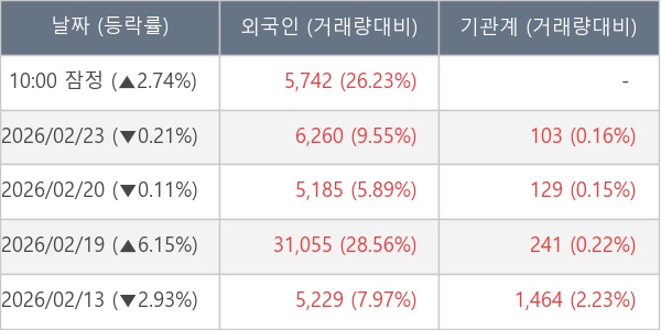 [서울=뉴스핌] 로보뉴스 = 24일 10시 15분 현재 인터로조(119610)는 전일 대비 2.74% (현재가 19,100원) 상승했고, 외국인이 최근 6일 연속 순매수(누적 61,814주, 잠정) 행진을 하고 있다.