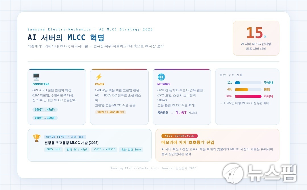 [서울=뉴스핌] 서영욱 기자 = 인공지능(AI) 서버 확산으로 적층세라믹커패시터(MLCC) 수요 구조가 빠르게 바뀌고 있다. 삼성전기는 AI 서버에 탑재되는 MLCC가 범용 서버 대비 최대 15배에 이른다고 보고, 컴퓨팅·전원·네트워크 3대 축을 중심으로 기술 고도화에 나선다. 칩 인접 초소형 고용량 제품과 고전압·고온 대응 라인업을 앞세워 AI 데이터센터 시장 공략을 본격화한다.