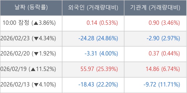 [서울=뉴스핌] 로보뉴스 = 24일 10시 15분 현재 테크윙(089030)은 외국인과 기관이 각각 0.14 만 주, 0.90 만 주 순매수(잠정) 하면서 전일 대비 3.86% (현재가 45,750원) 상승하고 있다.