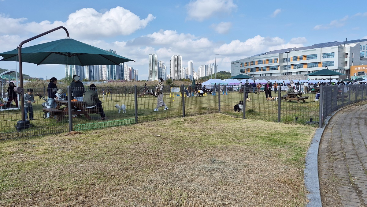 와스타디움 중앙광장 유휴부지에 조성된 반려견 놀이터에서 시민들이 반려견과 함께 시간을 보내고 있다. [사진=안산도시공사]