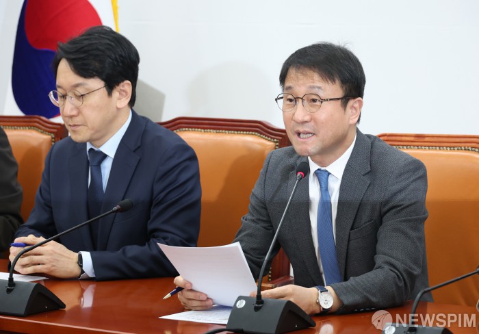 [서울=뉴스핌] 정일구 기자 = 한병도 더불어민주당 원내대표가 24일 오전 서울 여의도 국회에서 열린 원내대책회의에서 모두발언을 하고 있다. 2026.02.24 mironj19@newspim.com