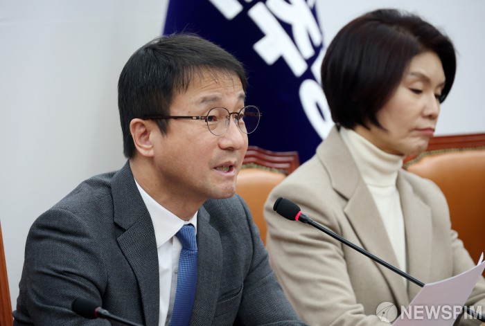 [서울=뉴스핌] 정일구 기자 = 한병도 더불어민주당 원내대표가 24일 오전 서울 여의도 국회에서 열린 원내대책회의에서 모두발언을 하고 있다. 2026.02.24 mironj19@newspim.com