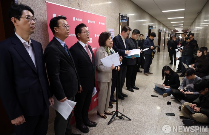 [서울=뉴스핌] 정일구 기자 = 국회 법제사법위원회 국민의힘 위원들이 24일 오전 서울 여의도 국회에서 법사위 전체회의 개의 지연 관련 항의 기자회견을 하고 있다. 왼쪽부터 주진우, 곽규택, 송석준, 조배숙, 나경원, 신동욱, 김재섭 의원. 2026.02.24 mironj19@newspim.com