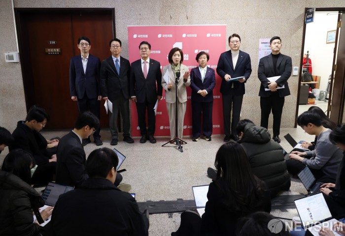 [서울=뉴스핌] 정일구 기자 = 국회 법제사법위원회 국민의힘 위원들이 24일 오전 서울 여의도 국회에서 법사위 전체회의 개의 지연 관련 항의 기자회견을 하고 있다. 왼쪽부터 주진우, 곽규택, 송석준, 조배숙, 나경원, 신동욱, 김재섭 의원. 2026.02.24 mironj19@newspim.com