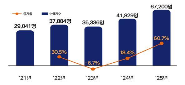 여성 육아휴직급여 수급자는 같은 기간 9만706명에서 11만7129명으로 29.1% 늘었다. 중소기업에서도 육아휴직 사용 증가세가 확인됐다. 중소기업 소속 육아휴직급여 수급자는 지난해 10만7559명으로, 2024년(7만5311명)보다 42.8% 증가했다.