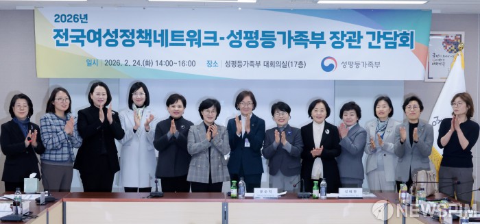 [서울=뉴스핌] 이길동 기자 = 원민경 성평등가족부 장관이 24일 서울 종로구 정부서울청사에서 열린 전국여성정책네트워크 간담회에서 참석자들과 기념촬영을 하고 있다.2026.02.24 gdlee@newspim.com