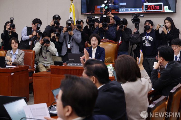 [서울=뉴스핌] 정일구 기자 = 24일 오후 서울 여의도 국회에서 열린 법제사법위원회 전체회의에서 추미애 위원장이 발언하고 있다. 2026.02.24 mironj19@newspim.com
