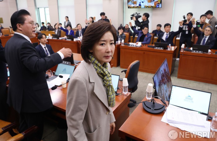 [서울=뉴스핌] 정일구 기자 = 24일 오후 서울 여의도 국회에서 열린 법제사법위원회 전체회의에서 전남·광주통합특별시 설치를 위한 특별법안에 대한 거수 표결이 진행되자 나경원 국민의힘 의원 등 법사위원들이 항의하고 있다. 2026.02.24 mironj19@newspim.com