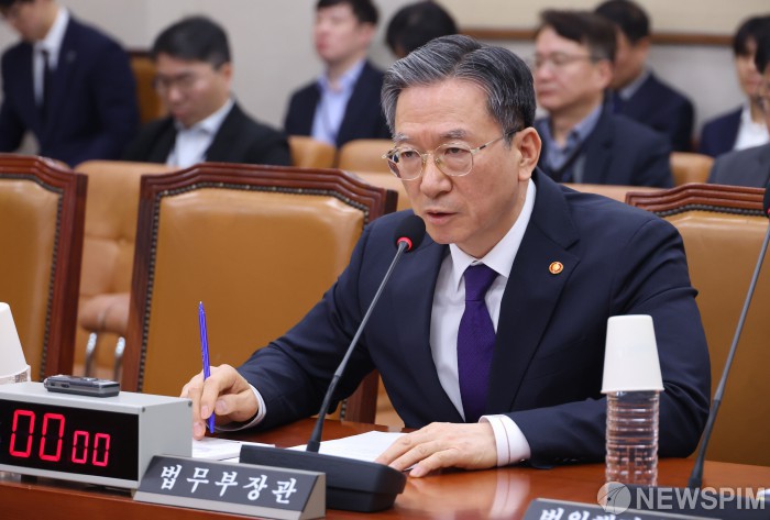 [서울=뉴스핌] 정일구 기자 = 정성호 법무부 장관이 24일 오후 서울 여의도 국회에서 열린 법제사법위원회 전체회의에서 의원 질의에 답변하고 있다. 2026.02.24 mironj19@newspim.com