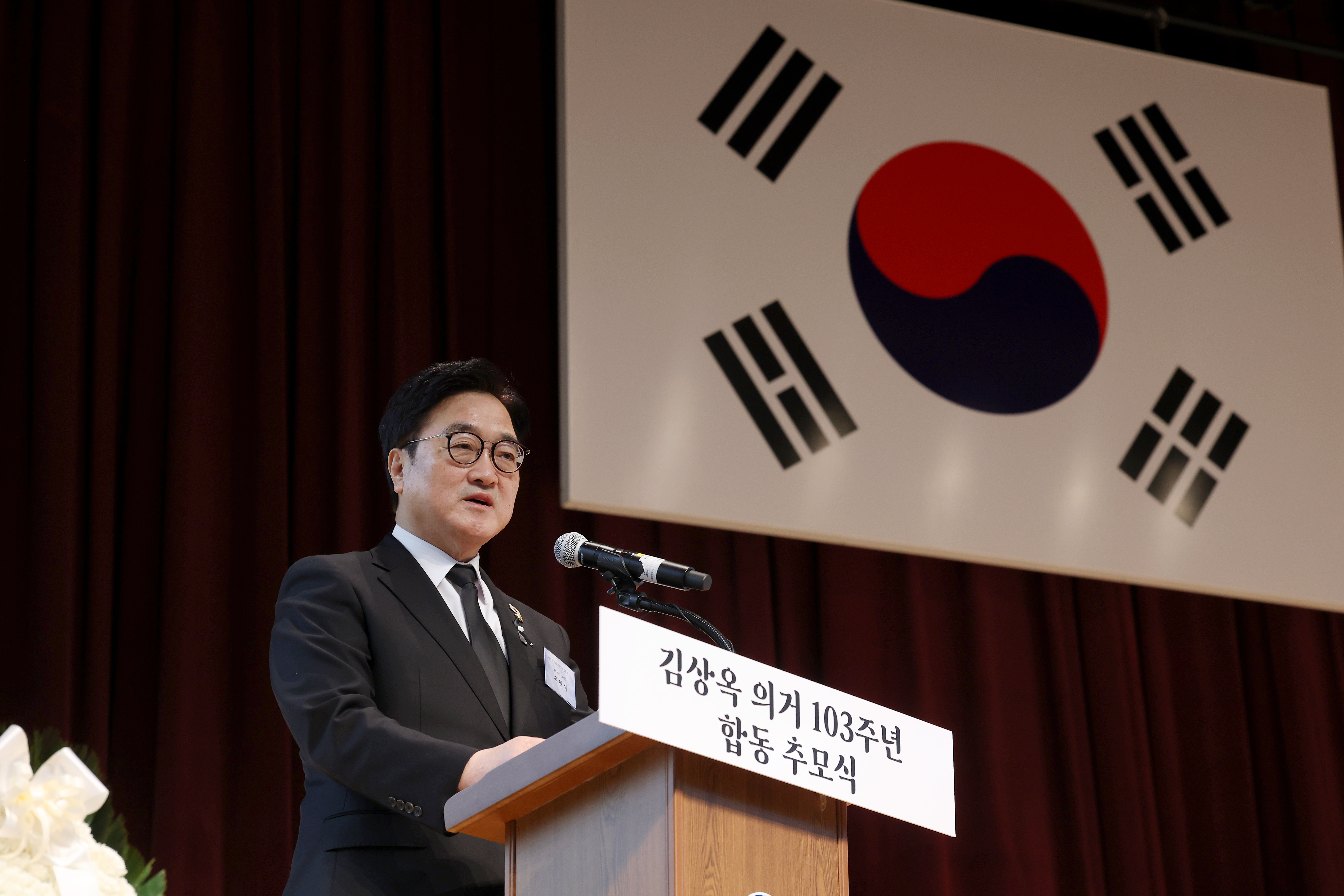 우 의장은 "공동의 역사를 기억하는 것은 우리의 뿌리를 확인하는 일인 동시에 대한민국의 정체성을 바로 세우는 일이고, 앞으로 대한민국을 더 단단하게 만드는 힘이 될 것"이라며 "이 추모식의 주제어처럼 '그날의 빛'이 '오늘의 대한민국'을 만들었고, 그 빛은 앞으로도 우리의 길을 비추어 줄 것"이라고 덧붙였다.