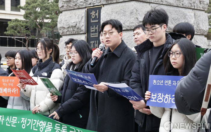 [서울=뉴스핌] 양윤모 기자= 미성년자의 신문·정기간행물 등록금지 헌법소원 청구 기자회견이 24일 오후 서울 종로구 헌법재판소 앞에서 '청소년 독립신문 도끼풀' 주최로 열렸다. 2026.02.24 yym58@newspim.com