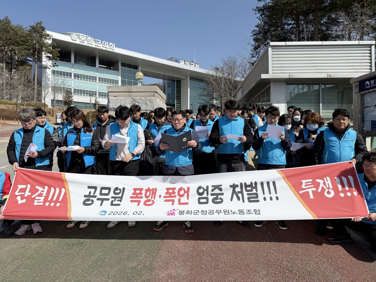 경북 봉화군공무원노조가 23일 성명을 내고 봉화군 재산면사무소에서 발생한 민원인의 공무원 폭행 사건 관련 "철저한 수사와 엄정한 처벌을 촉구"하고 있다.[사진=봉화군공노조] 2026.02.24 nulcheon@newspim.com