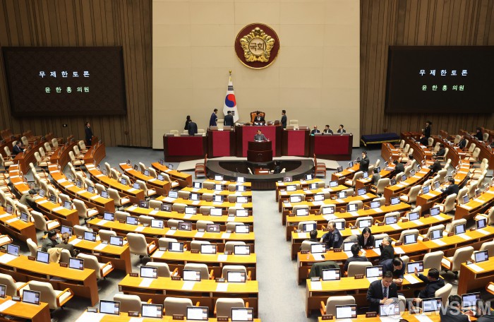 [서울=뉴스핌] 정일구 기자 = 윤한홍 국민의힘 의원이 24일 오후 서울 여의도 국회에서 열린 제432회국회(임시회) 제8차 본회의에서 상법 일부개정법률안(대안)에 대한 무제한 토론(필리버스터)을 하고 있다. 2026.02.24 mironj19@newspim.com