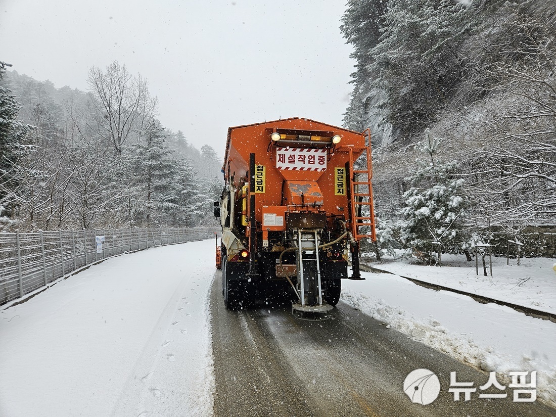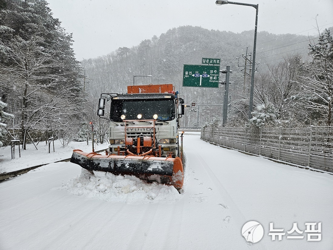 또 국토관리청 울진 출장소와 경북도 북부 사업소도 제설 차량 4대와 인력 8명을 투입해 취약 도로 제설 작업에 주력하고 있다.