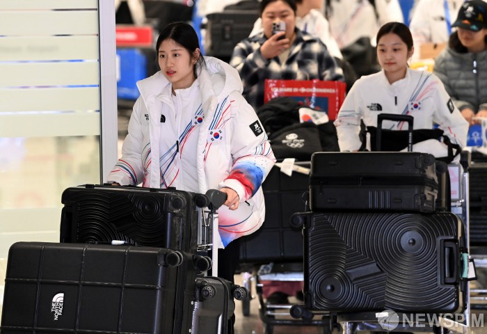 [영종도=뉴스핌] 류기찬 기자 = 피겨스케이팅 이해인(왼쪽)과 신지아가 24일 밀라노·코르티나담페초 동계 올림픽을 마치고 인천공항을 통해 귀국하고 있다. 2026.02.24 ryuchan0925@newspim.com